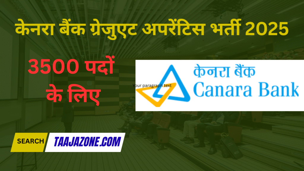 केनरा बैंक ने ग्रेजुएट अपरेंटिस के पदों पर भर्ती के लिए एक बड़ी घोषणा की है। इस भर्ती अभियान के तहत कुल 3500 रिक्त पदों को भरा जाएगा। जो उम्मीदवार बैंकिंग सेक्टर में अपना करियर बनाना चाहते हैं, उनके लिए यह एक शानदार अवसर है। इच्छुक और योग्य उम्मीदवार केनरा बैंक की आधिकारिक वेबसाइट के माध्यम से ऑनलाइन आवेदन कर सकते हैं। आवेदन करने की अंतिम तिथि 12 अक्टूबर 2025 है।